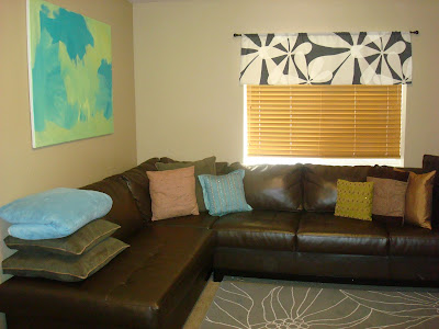 We added a rug from the office, a curtain topper and a few colorful pillows.